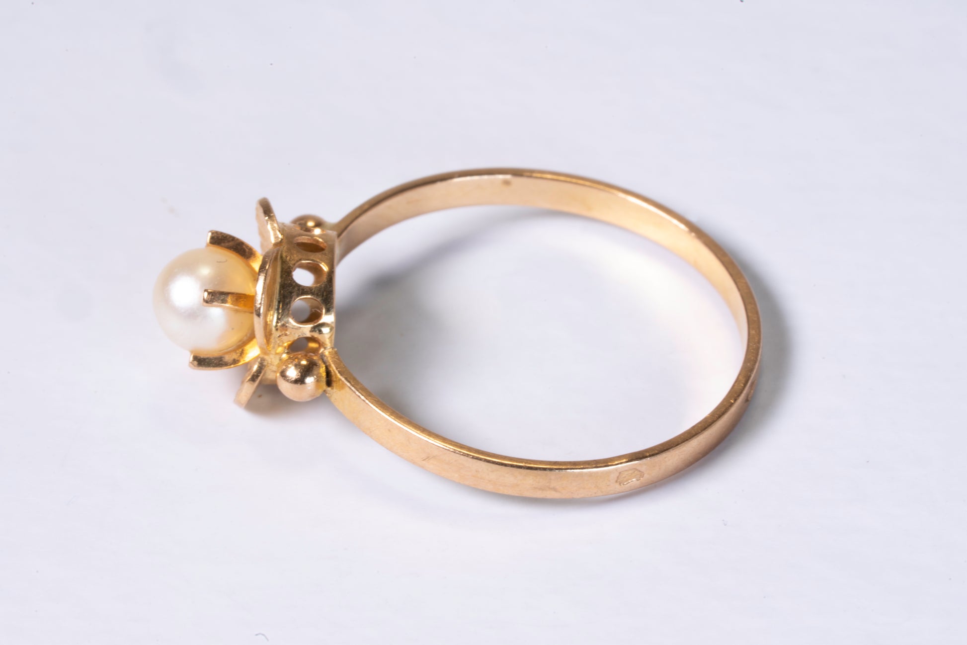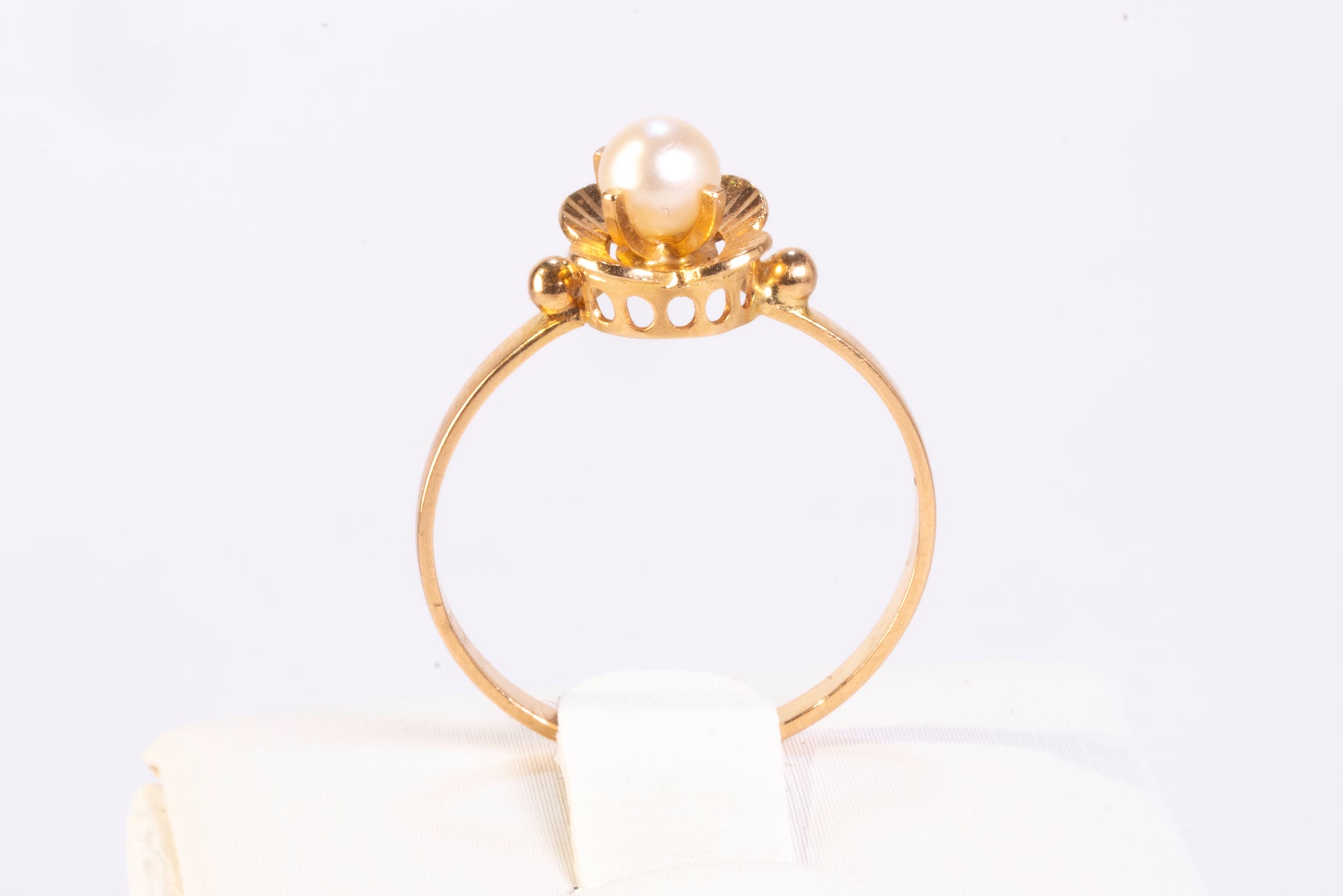 Elle est centrée par une perle de culture de forme ronde, présentant un orient blanc crème avec des reflets subtils, montée sur une coupelle en or. La perle est logée dans un chaton ajouré, travaillé en forme de fleur stylisée, dont les pétales sont sculptés et ajourés, créant un effet de légèreté et de volume. La structure de ce chaton permet une diffusion de la lumière autour de la perle. Le corps de bague, de section droite et polie, assure un confort au porté. L'ensemble de la monture est poli pour maximiser l'éclat de l'or.