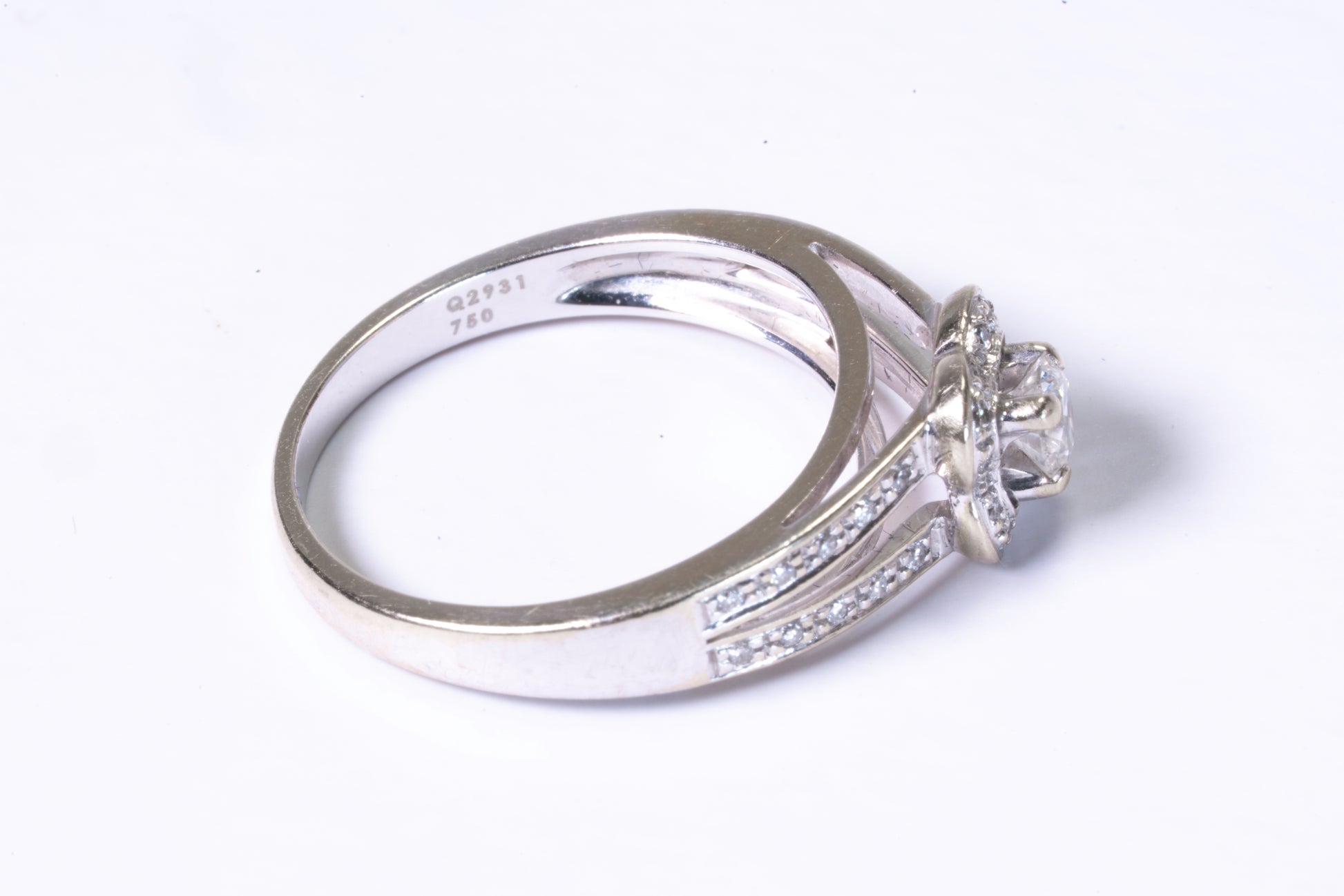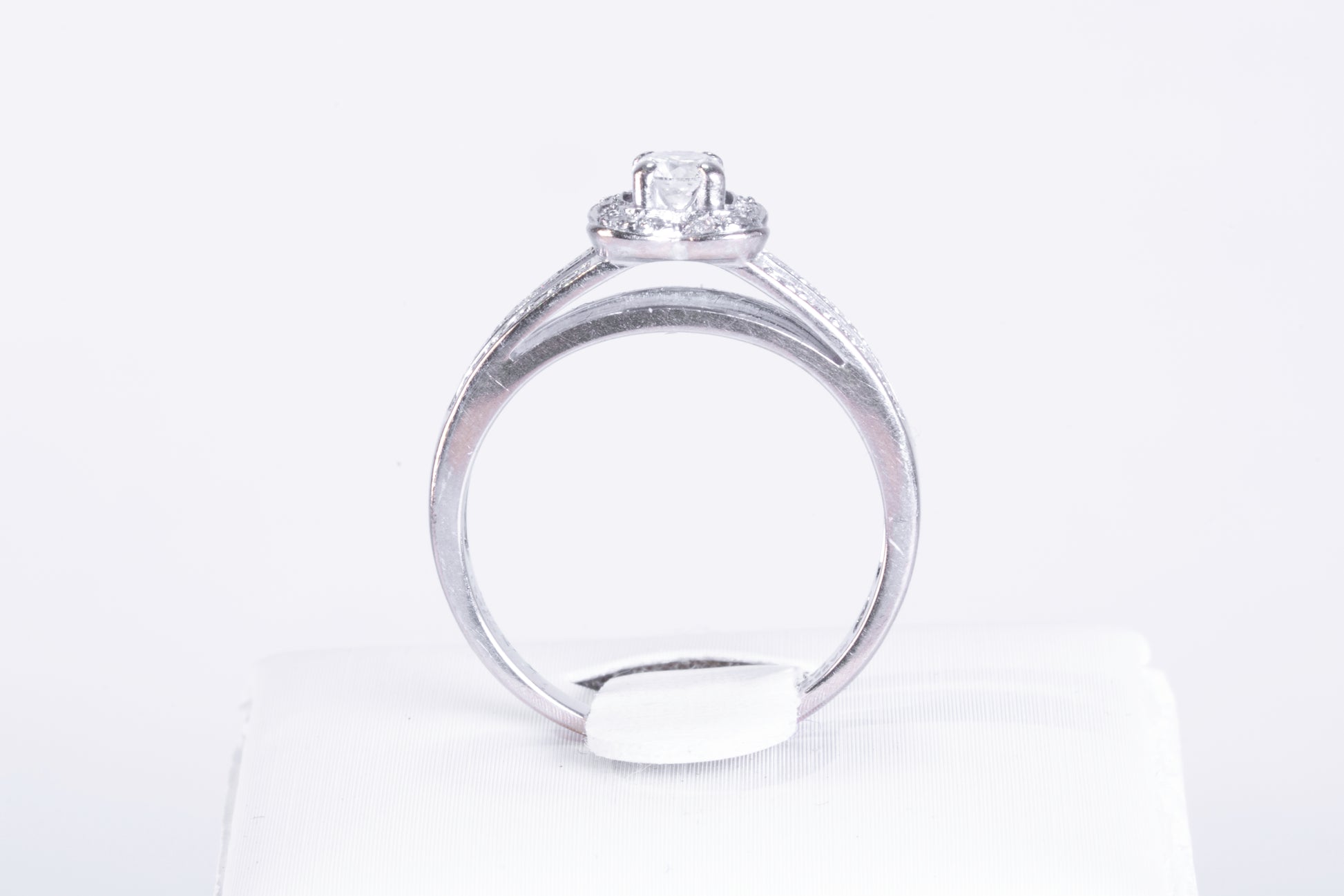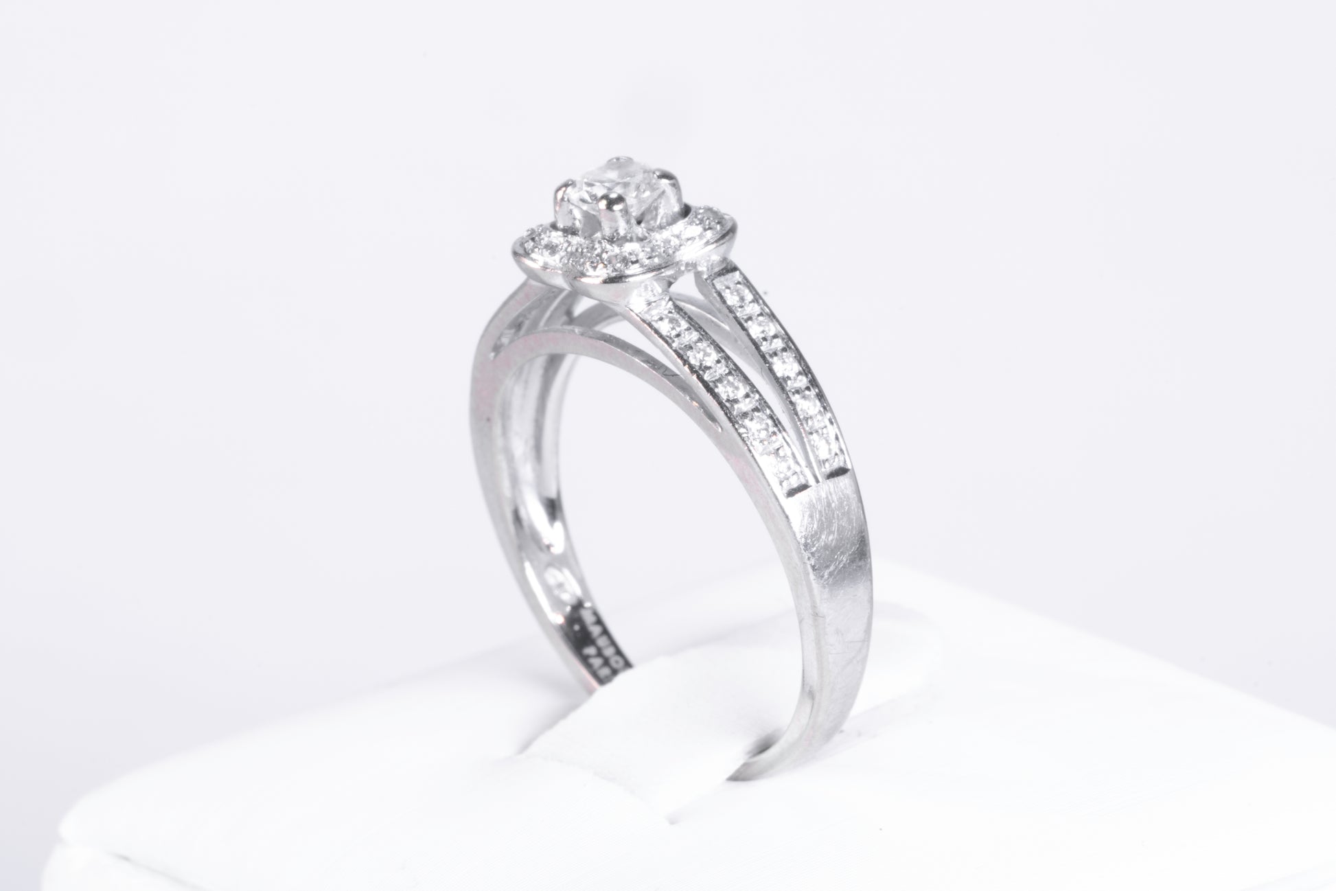 Elle est centrée par un diamant solitaire taille brillant d'environ 0,20 carat, serti par quatre griffes robustes. Ce diamant est entouré d'un halo de diamants taille brillant plus petits, épousant une forme de cœur stylisé qui accentue la perception du volume. Le corps de bague est divisé en deux sections parallèles, chacune pavée de diamants sertis rail. Les surfaces intérieures de l'anneau comportent les gravures attestant de l'origine et de la qualité du bijou.