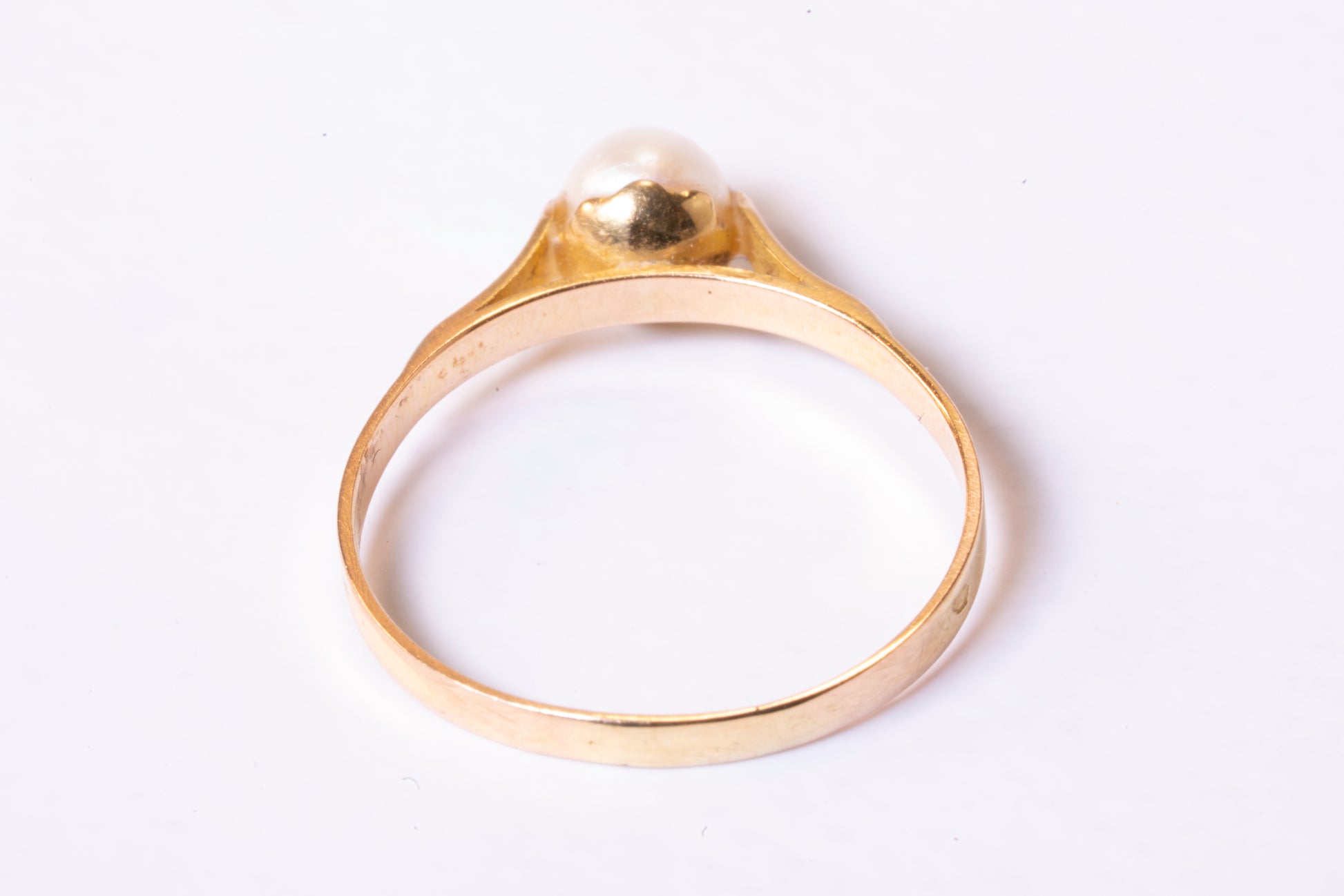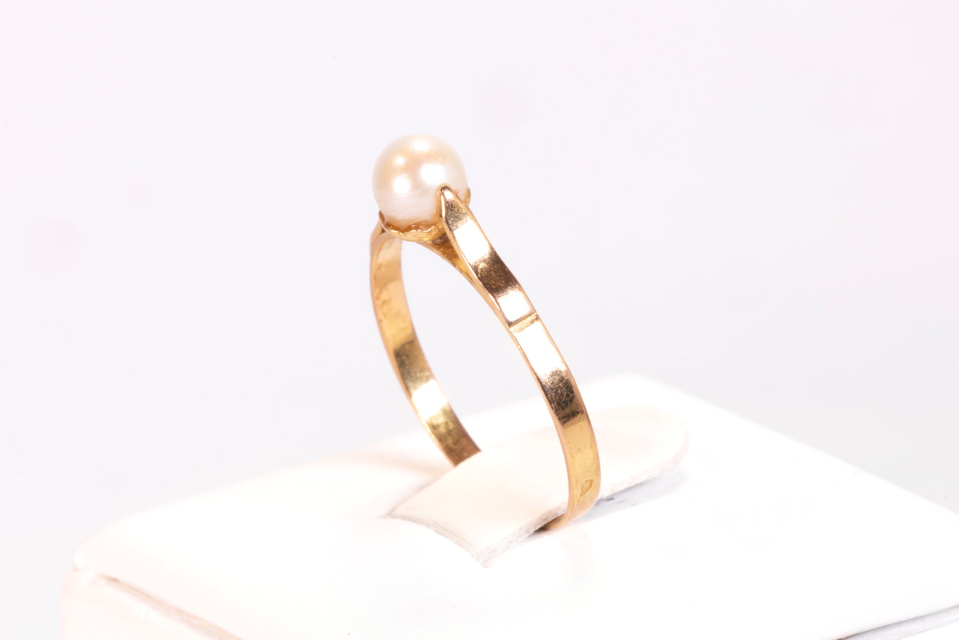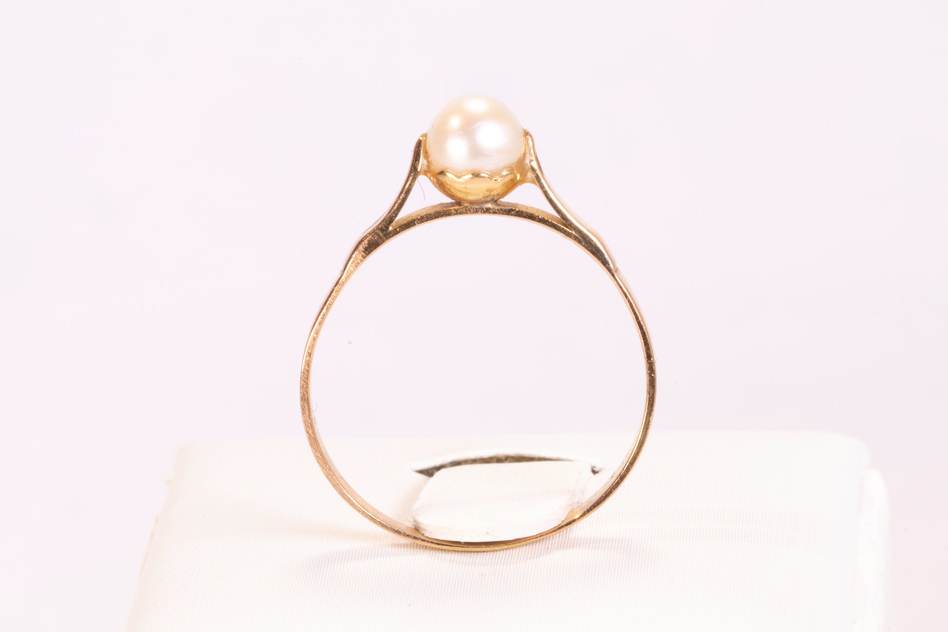 Le jonc est de section droite et uniforme, s'élargissant en une monture architecturale aux épaules ouvertes. La pièce est centrée sur une perle de culture de forme ronde, affichant un lustre blanc crème et un diamètre d'environ 8 millimètres. La perle est solidement maintenue par un sertissage discret à deux griffes et de maintien par la structure d'or qui l'enserre aux pôles.