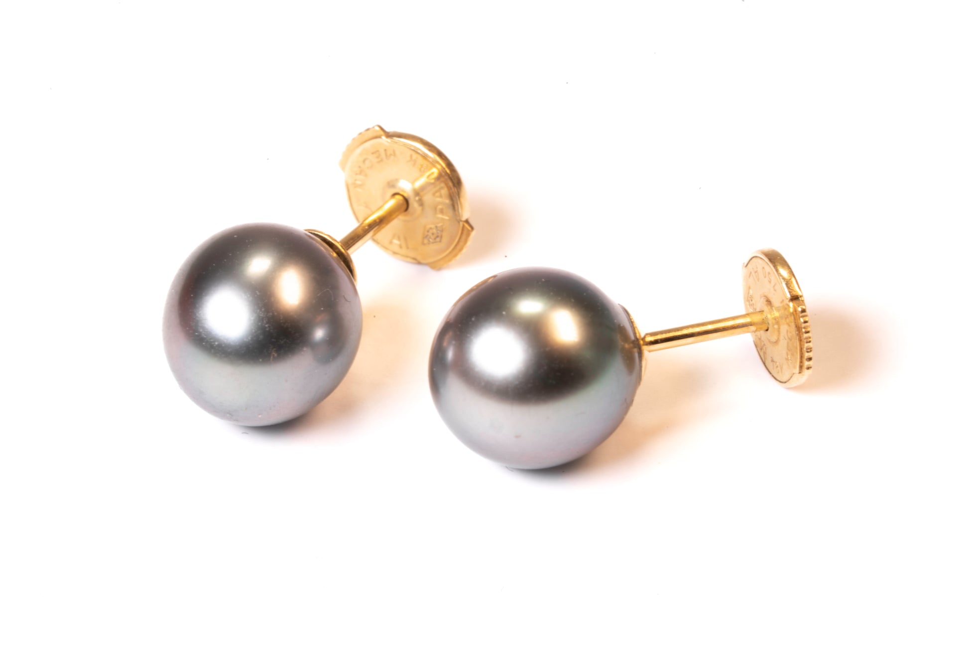 Chaque pièce est centrée par une perle de culture de Tahiti, caractérisée par une forme ronde et un lustre métallique soutenu, affichant des nuances de gris anthracite. Le diamètre de chaque perle est d'environ 8 millimètres, garantissant une présence visuelle notable. La perle est solidement chevillée à la tige d'or, qui est conçue pour recevoir un fermoir de sécurité de type Alpa. Ce système de fixation est identifiable par son disque cranté et son mécanisme de verrouillage interne qui assure un maintien maximal sur le lobe, éliminant le risque de perte.