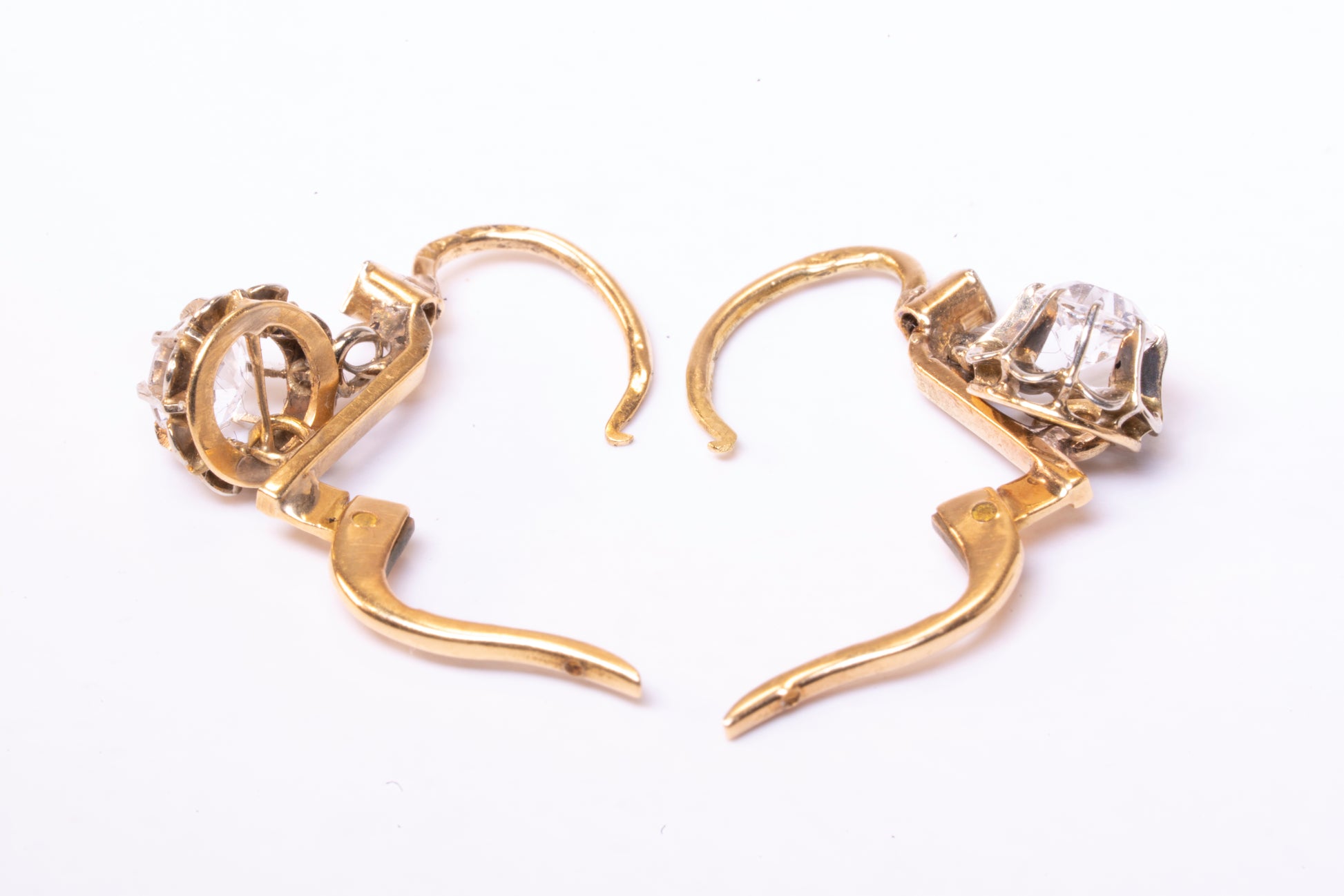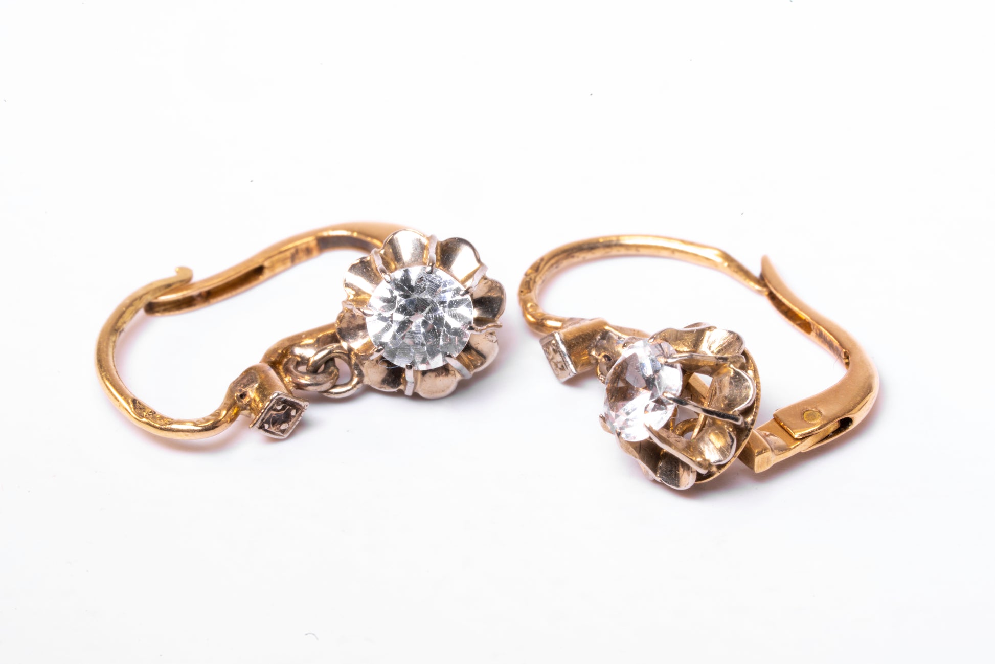Chaque boucle d'oreille est montée sur un système à charnière mobile avec un crochet de sécurité pour la fermeture, assurant une fixation fiable au lobe. La pièce maîtresse est une pierre centrale de taille ronde, identifiée comme un saphir blanc, dont le poids est estimé à 0,30 carat par pièce. La pierre est sertie à griffes sur une monture ouvragée en forme de fleur, dont le dessin dentelé renforce l'aspect du serti.